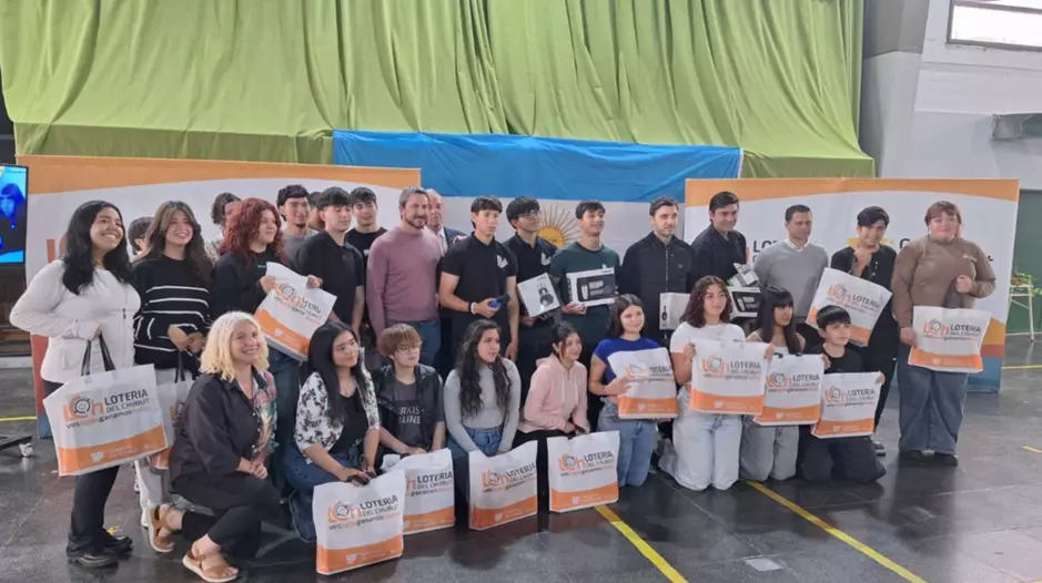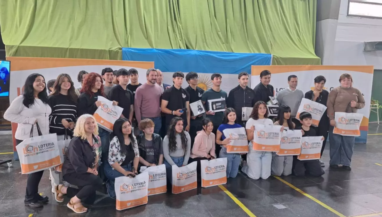 La entrega se dio en el marco de un concurso sobre ludopatía lanzado por Lotería del Chubut, del cual salieron ganadores los alumnos de 6º 1ra. La institución recibió seis notebooks y equipamiento para sus talleres de comunicación.