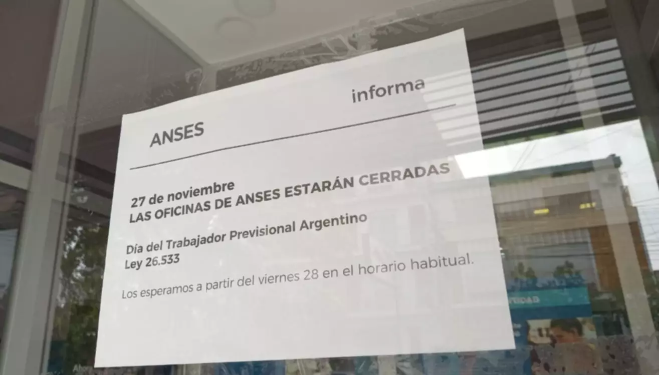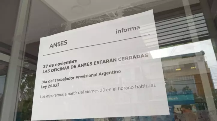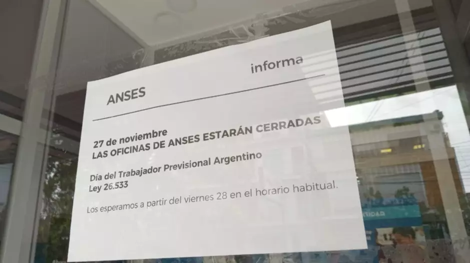 La oficina de ANSES ubicada en Pellegrini 461, en Trelew, no abrió sus puertas este jueves 27 de noviembre debido al Día del Trabajador Previsional Argentino, establecido por la Ley 26.533. La información fue comunicada mediante un cartel colocado en el ingreso al edificio.
