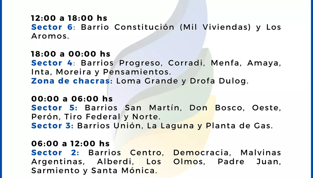 La Cooperativa informa los horarios en los que se habilitará el agua en los sectores 2, 3, 4, 5 y 6. En algunos barrios del Sector 1 (Santa Catalina, 22 de Agosto, Villa Italia), se potencia la distribución con otros sectores.