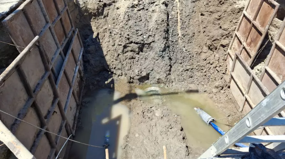 Para alcanzar el conducto fue necesario deprimir la napa freática mediante un operativo técnico de gran complejidad. Hasta esta jornada permanecieron en funcionamiento siete bombas de extracción, cada una con una capacidad de 6.000 litros por hora, que trabajaron de forma continua a una profundidad cercana a los ocho metros.