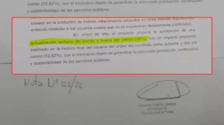 En la nota elevada se detalla que "el proyecto propicia la aprobación de una actualización tarifaria del treinta y nueve por ciento (39%) con un impacto promedio estimado en la factura final del usuario del orden del veintitrés coma ochenta y dos por ciento (23.82%), con el exclusivo objeto de garantizar la adecuada prestación, continuidad y sostenibilidad de los servicios públicos".