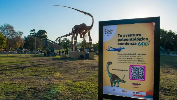 Una de las acciones más destacadas es el concurso durante la muestra de la réplica de Patagotitan en el Parque Thays de Buenos Aires, una iniciativa conjunta con el Ministerio de Turismo y Areas Protegidas de Chubut y el Entretur. Quienes escaneen el código QR de uno de los carteles informativos participan por un viaje de 4 días a Trelew, con alojamiento, excursiones, gastronomía incluida y la experiencia de conocer la casa del DINO, el MEF.